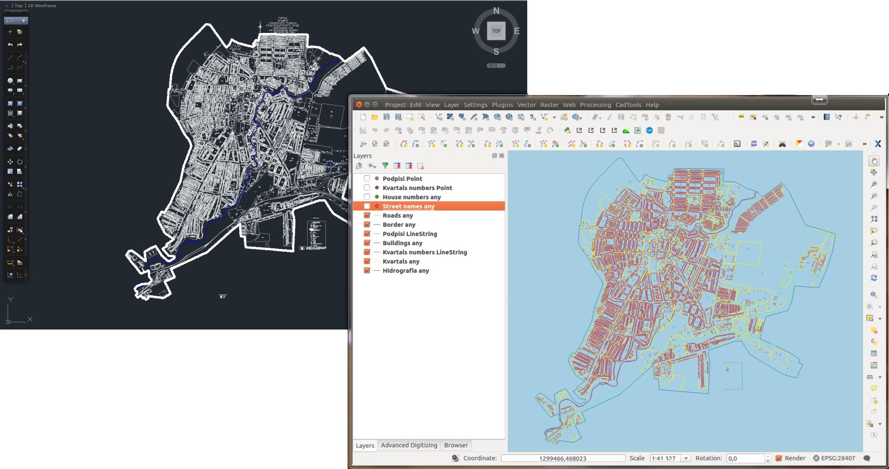 This week my mentor (Dmitry Baryshnikov) have succesfully built QGIS with CAD Driver. There are some screenshots and little comparisons to ArcGIS and ACAD.